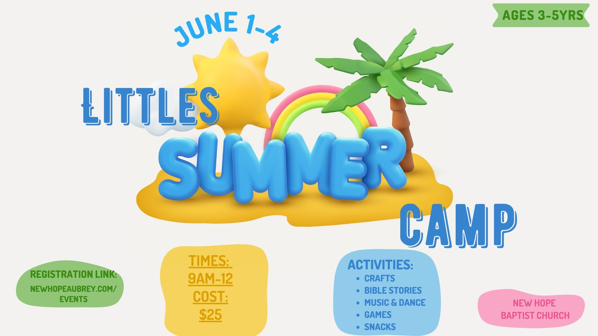 This awesome mini-camp is for kids who are ages 3-5! Cost is $25 per child. Your littles will love this day camp designed just for them, full of fun music, games and snacks, while learning all about the love of Jesus. Register today!