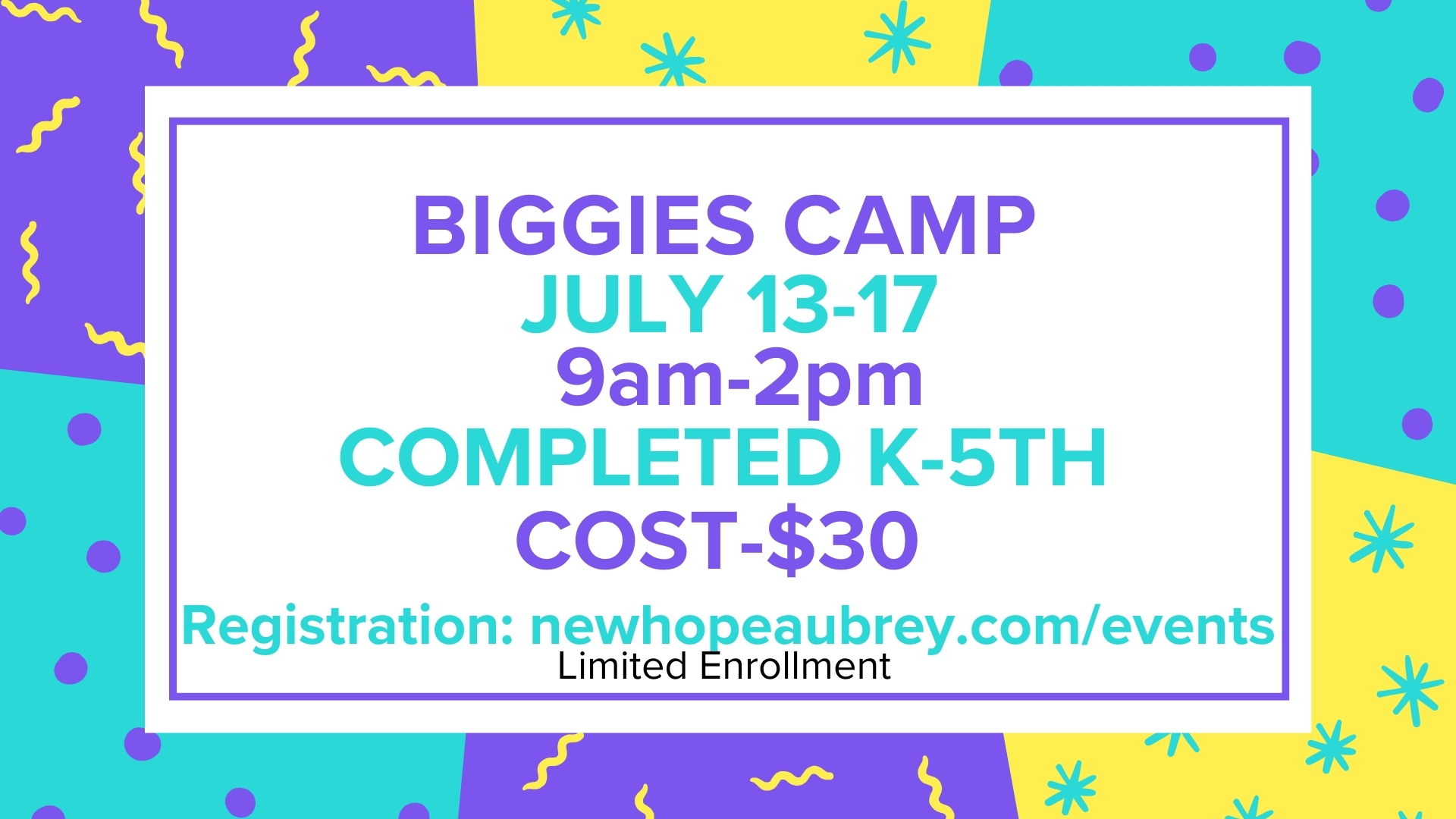 Biggies Camp is a daily, 5-day camp for our older kids: those who have completed Kindergarten to those who have completed 5th grade. Each day, from 9 AM to 2 PM, kids will come together to have a blast learning about Jesus! The cost is $30 per child. Pay online with credit or debit card, or contact Rhoda Addison for more options. For more information, contact rhoda@newhopeaubrey.com.